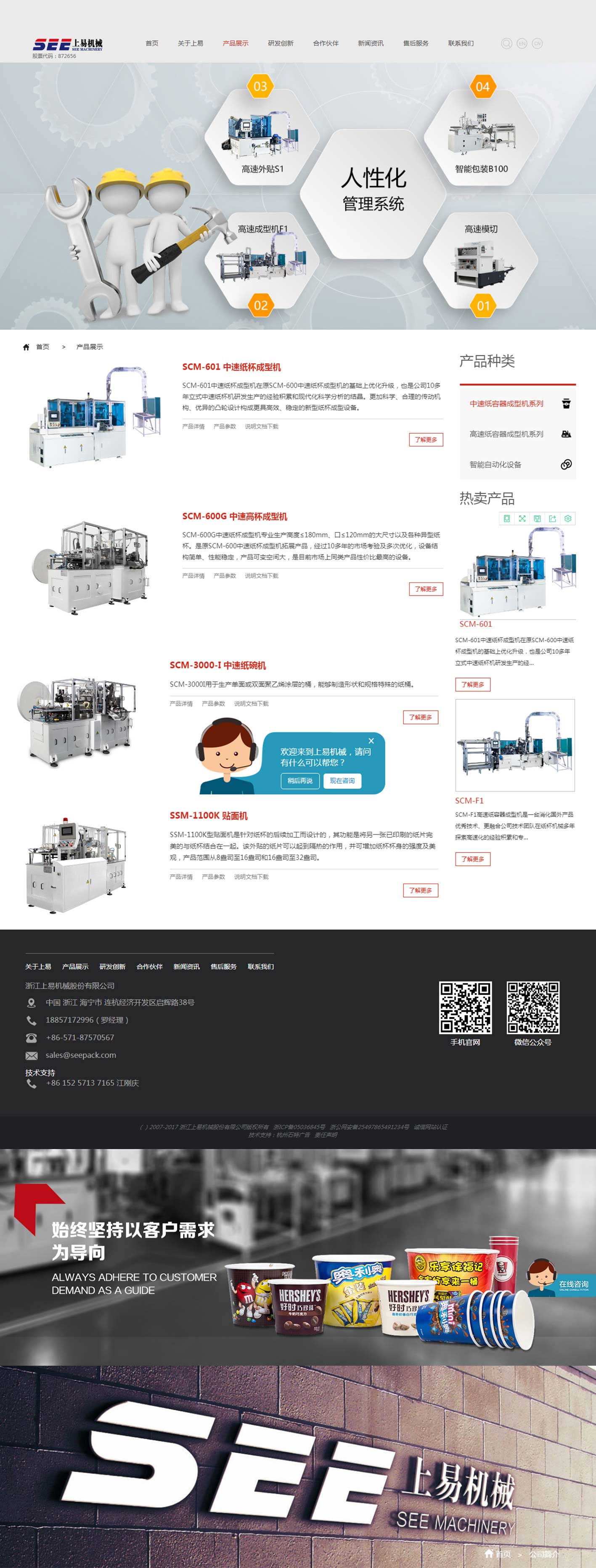 浙江上易機(jī)械股份有限公司成立于2007年,是一家專業(yè)從事紙容器成型裝備研發(fā)、生產(chǎn)的科技型企業(yè)、國家重大科技項“弧面凸輪加工工藝研究/弧面凸輪產(chǎn)業(yè)化”研究單位、國內(nèi)中速紙杯成型機(jī)、高速紙杯成型機(jī)首創(chuàng)單位、本領(lǐng)域首家新三板上市公司。公司擁有完善的凸輪制造工藝和國內(nèi)最先進(jìn)的凸輪實驗室以及國內(nèi)唯一的凸輪動靜態(tài)測試平臺;公司具有健全的CE、ISO9001等認(rèn)證體系及國家進(jìn)出口權(quán)。