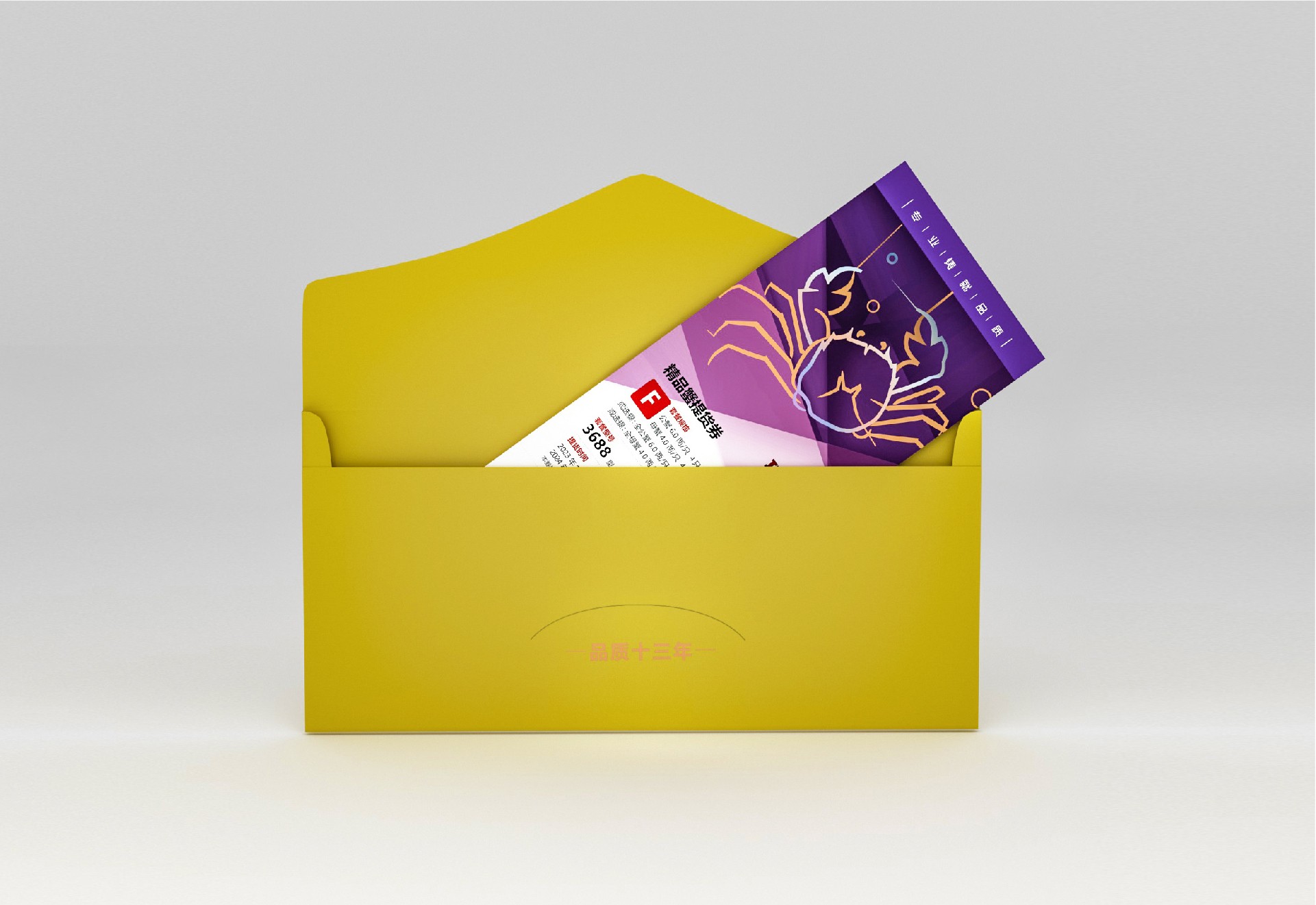采用信封式包裝,以黃色為主色調(diào),代表大閘蟹的鮮美。在信封的正面上部印有瑞王大閘蟹的LOGO,以突出品牌形象,并附上“品質(zhì)十三年”的口號,展示企業(yè)的信譽度。