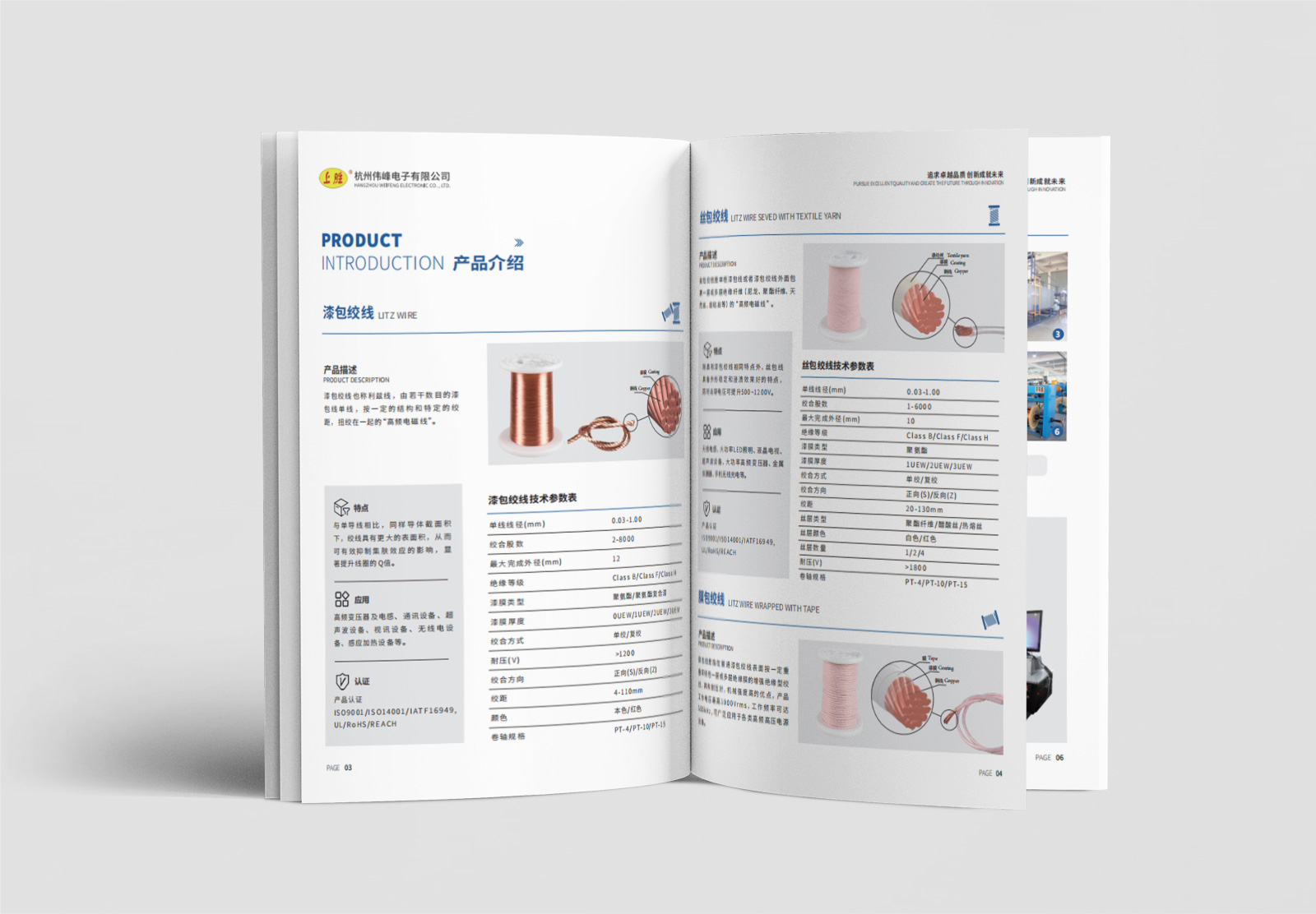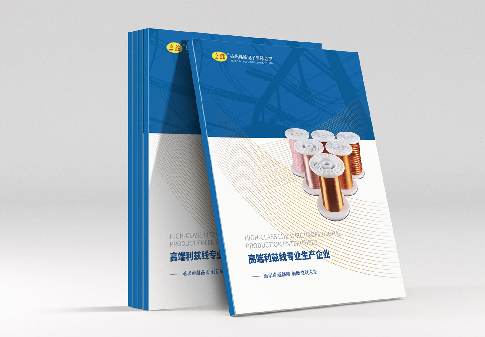 杭州偉峰電子有限公司是一家有近30年歷史的高端銅繞組線專業生產企業,主要生產漆包絞合線、絲包漆包絞合線、膜包漆包絞合線三個系列、共40多個品種的繞組線,公司產品廣泛應用于高頻電感、無線充電等多個領域,客戶遍及中國、韓國、日本、澳大利亞、俄羅斯等十幾個國家,年產繞組線超過3000噸。為能更好的展示企業實力及品牌形象,偉峰電子希望通過宣傳冊為對外宣傳的一個重要窗口,因此找到石特。