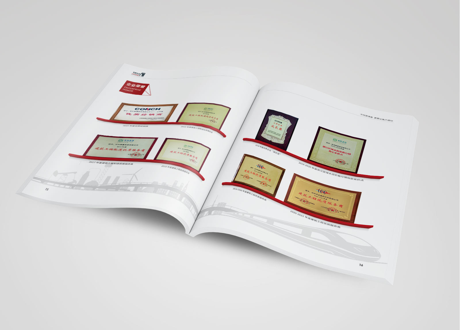 設計師根據企業LOGO的形狀,企業的行業屬性,鏡像畫冊版面設計,畫冊整體風格偏硬朗,畫冊中會根據文案進行小圖標設計,豐富畫面,突出數據。