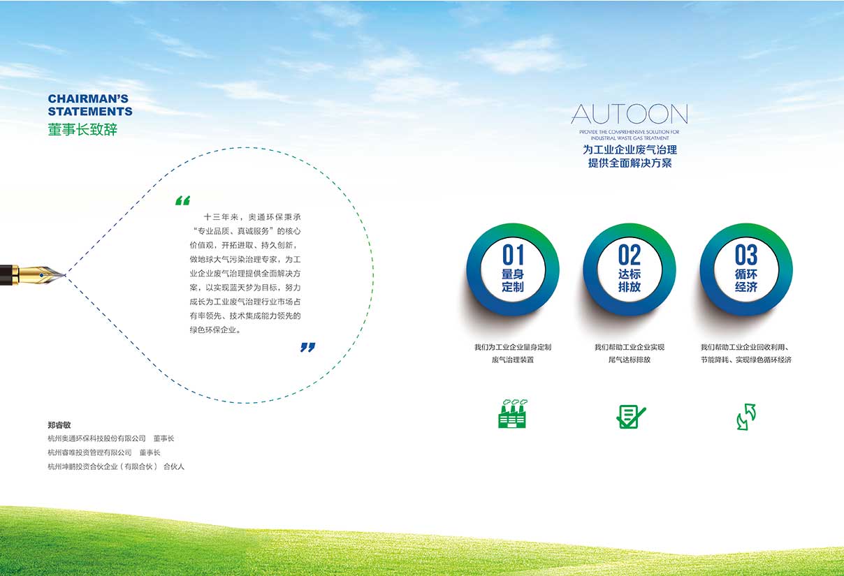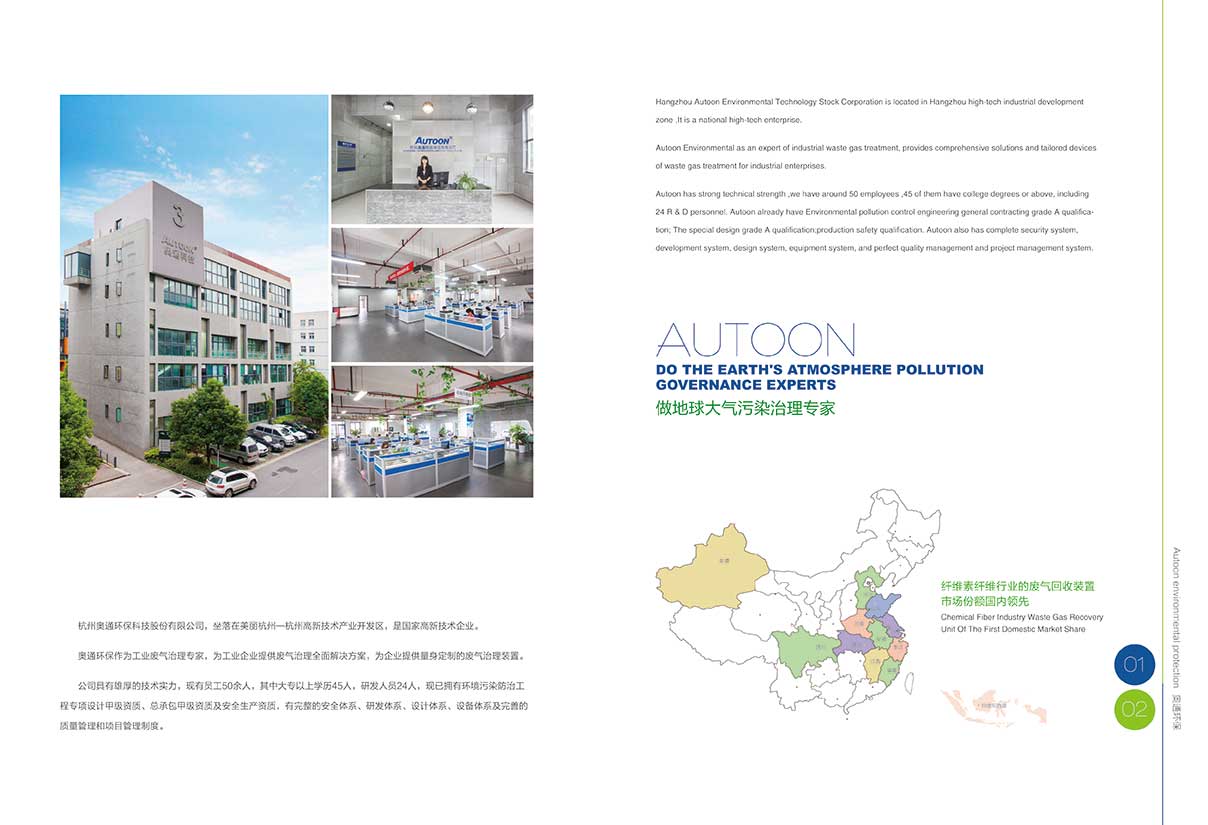 奧通環保作為工業廢氣治理專家,為工業企業提供廢氣治理 全面解決方案,為企業提供量身定制的廢氣治理裝置。公司具有雄厚的技術實力,現有員工50余人,其中大專以上學歷45人,研發人員24人,擁有環境污染防 治工程專項設計甲級資質、總承包甲級資質、環保工程專業承包三級資質及安全生產資質,完整的安全體系、設計體系、采購及監造體系及完善的質量管理和項目管 理制度,以驅散中國霧霾噩夢,實現藍天夢為目標,努力成長為工業廢氣治理行業市場占有率第一,技術集成能力第一的綠色環保企業。