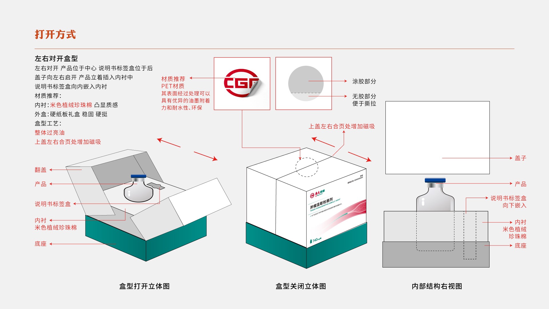 腫瘤溫敏栓塞劑作用于肝癌腫瘤患者,該醫(yī)療器械需取放便捷,我們采用雙開門的開口方式,開口處有磁吸與標(biāo)貼,雙重防護,標(biāo)貼并非全覆蓋粘貼,有涂膠與非涂膠部分,在保證產(chǎn)品安全的同時不失便捷。