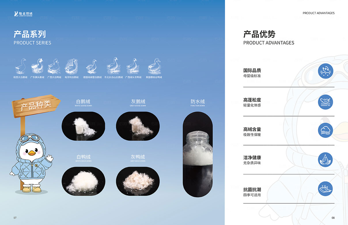 設計階段,團隊以 “簡約大氣、凸顯質感” 為原則,將羽絨制品的柔軟屬性與企業的專業形象相融合。在色彩選擇上,采用淺色系為主色調,搭配品牌特色色作為點綴,營造舒適、高端的視覺氛圍;在版式設計上,注重信息層級的清晰呈現,通過合理的留白、圖文配比,讓讀者能夠輕松獲取關鍵信息,同時融入羽絨紋理、羽毛等元素作為設計細節,強化品牌辨識度。