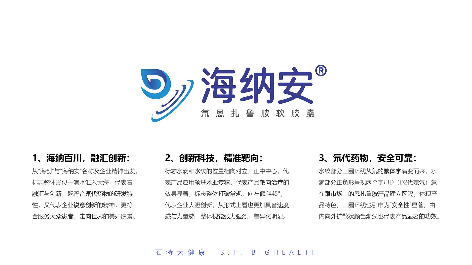 1、海納百川,融匯創(chuàng)新:從“海創(chuàng)”與“海納安”名稱及企業(yè)精神出發(fā),標(biāo)志整體形似一滴水匯入大海,代表著融匯與創(chuàng)新,既符合氘代藥物的研發(fā)特性,又代表企業(yè)銳意創(chuàng)新的精神,更符合服務(wù)大眾患者,走向世界的美好愿景。