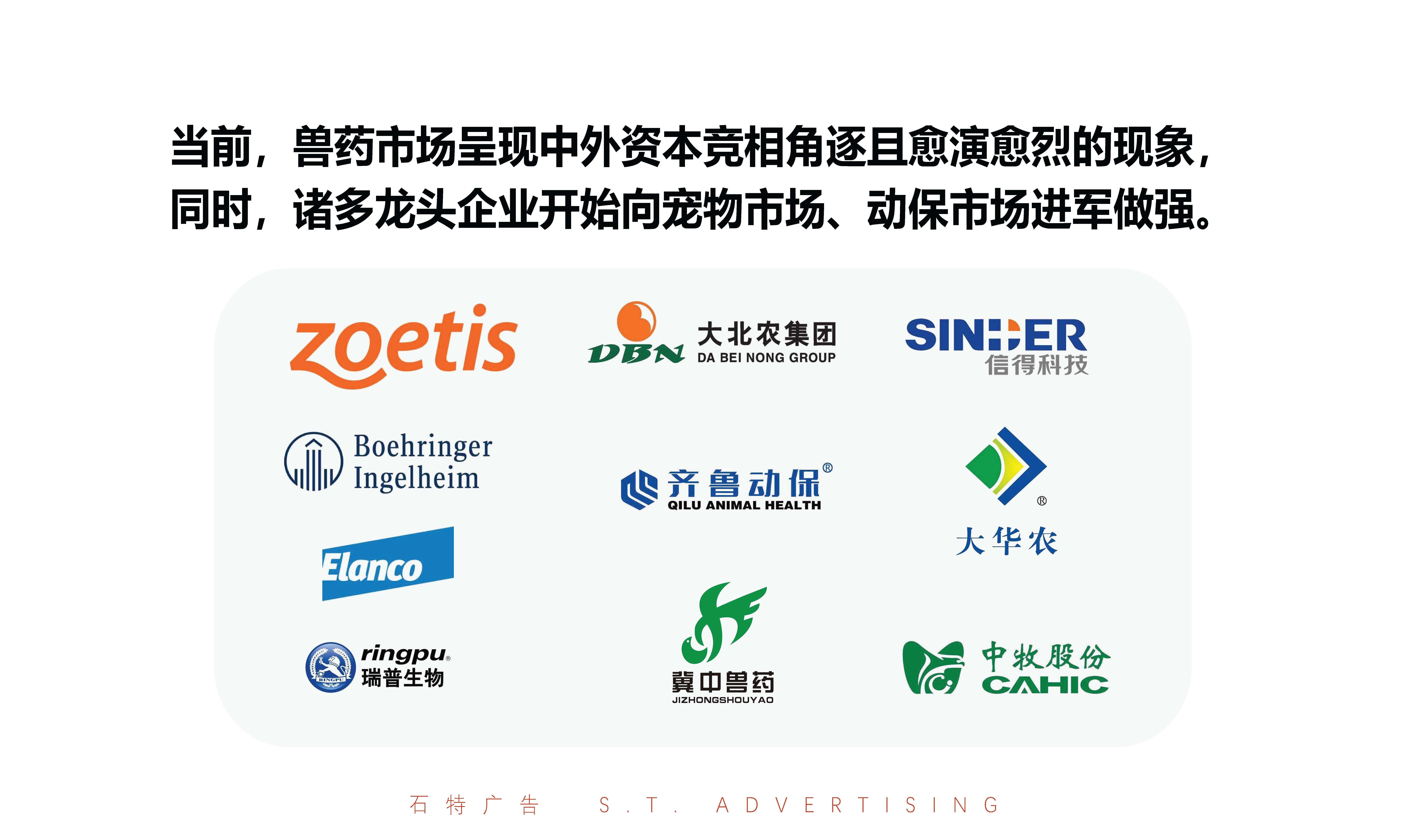 對耐斯康品牌在市場中的競爭對手進行了調(diào)查分析后得知:當前,獸藥市場呈現(xiàn)中外資本競相角逐且愈演愈烈的現(xiàn)象, 同時,諸多龍頭企業(yè)開始向?qū)櫸锸袌觥颖J袌鲞M軍做強。