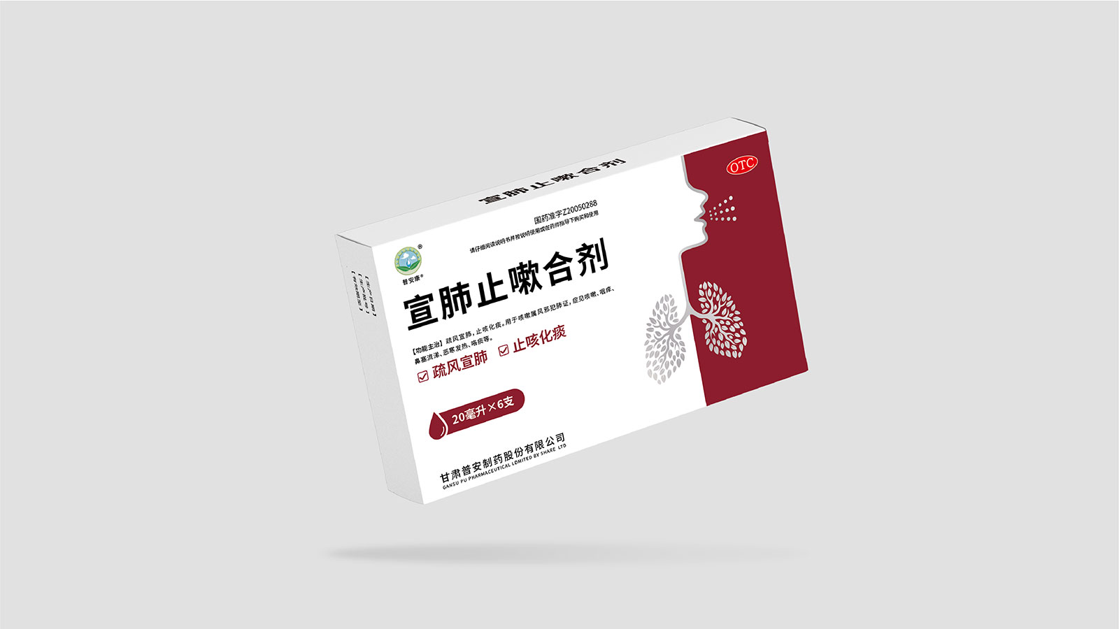 包裝整體風格以極簡為主,在凸出產品通用名的同時,將產品核心主治功能——疏風宣肺、止咳化痰以簡潔圖案展示于畫面,并作為畫面核心視覺元素。產品成分以中草藥為主,又聯想到產品功能主治特征,顧將兩者結合,用代表中草藥的樹葉和肺的整體形態進行融合、替換,凸顯產品中成藥屬性,將肺、呼吸道、人物側臉剪影和代表呼吸感的小點相結合,呼應產品主治功能特征。考慮到產品性狀為液體形態,因此將代表液體的水滴形態融合畫面和產品規格相結合,并做強調處理,凸顯產品性狀的同時以便于消費者準確查看及區分產品不同規格。