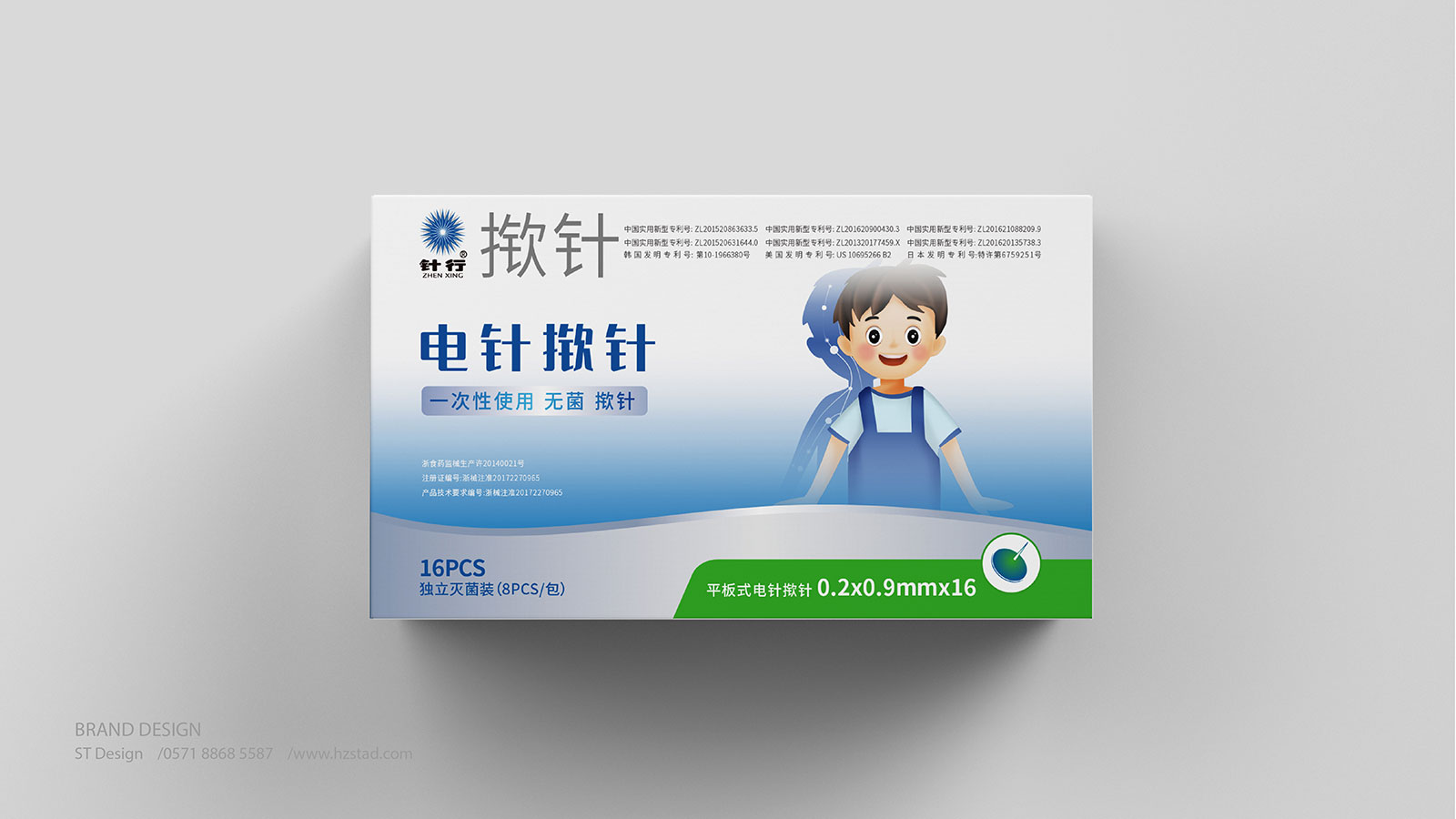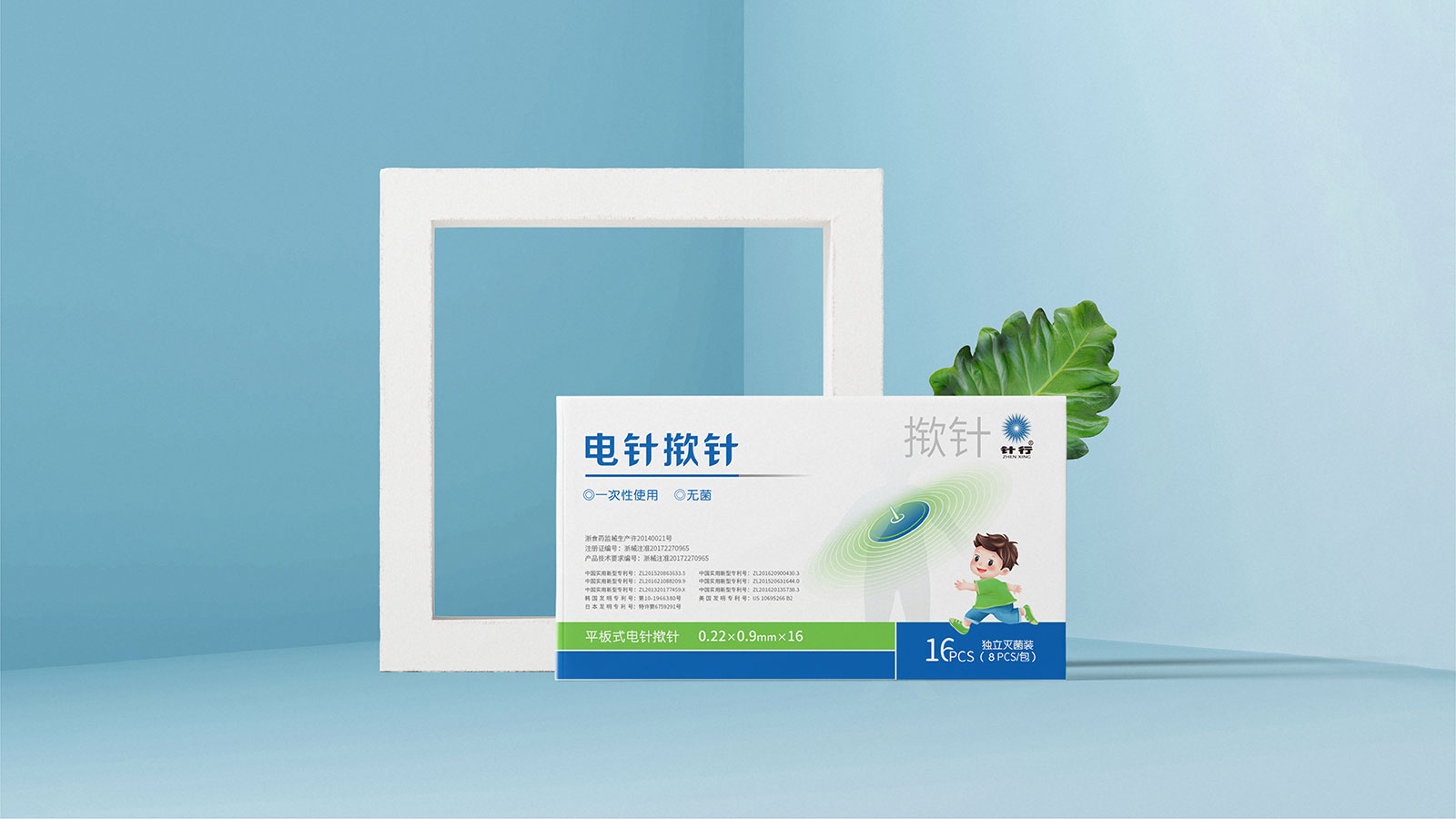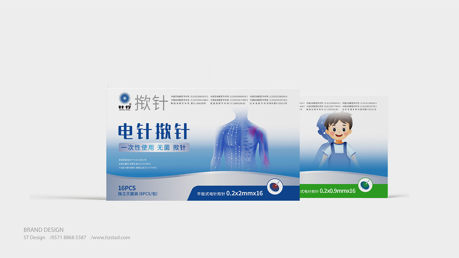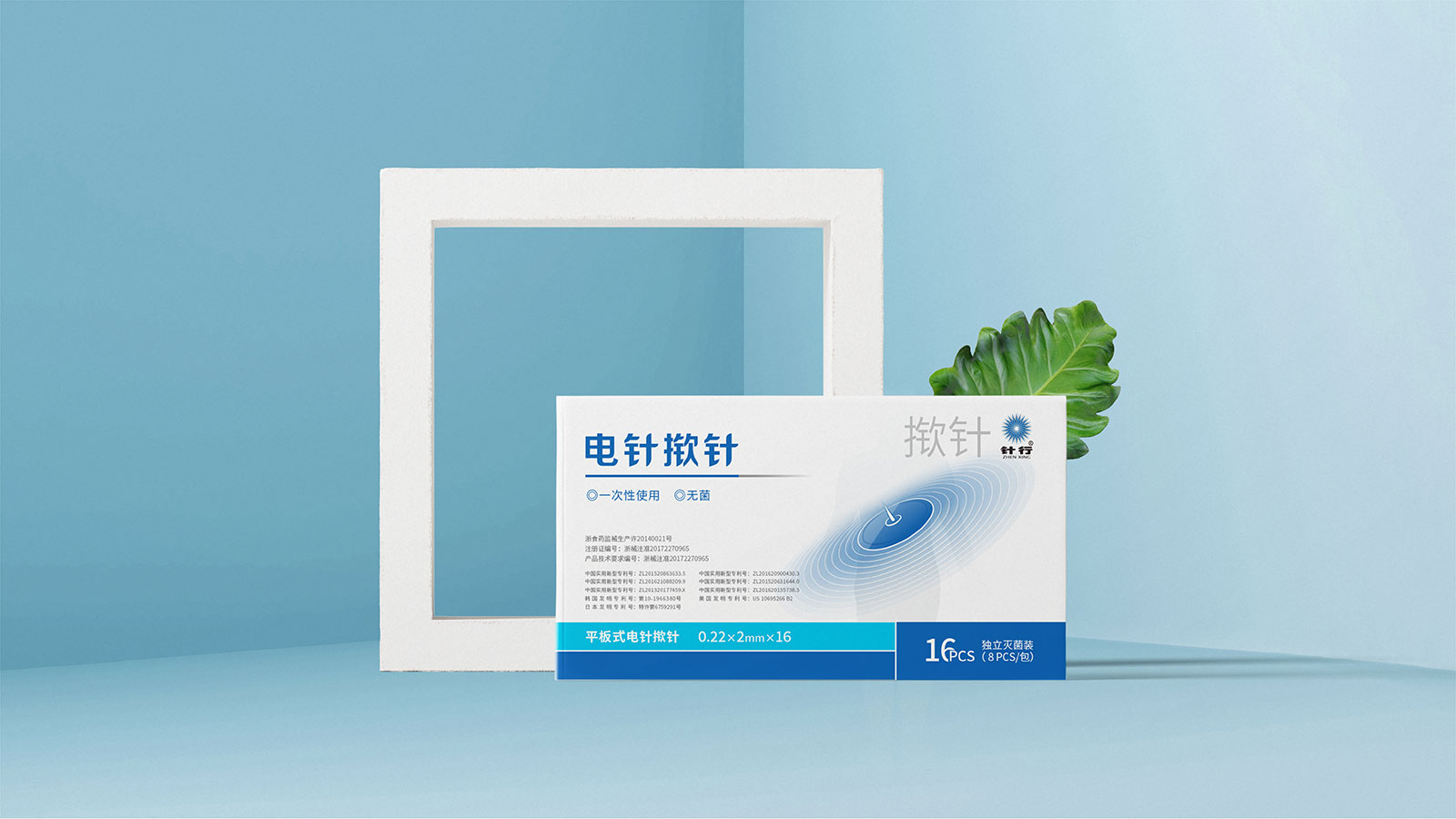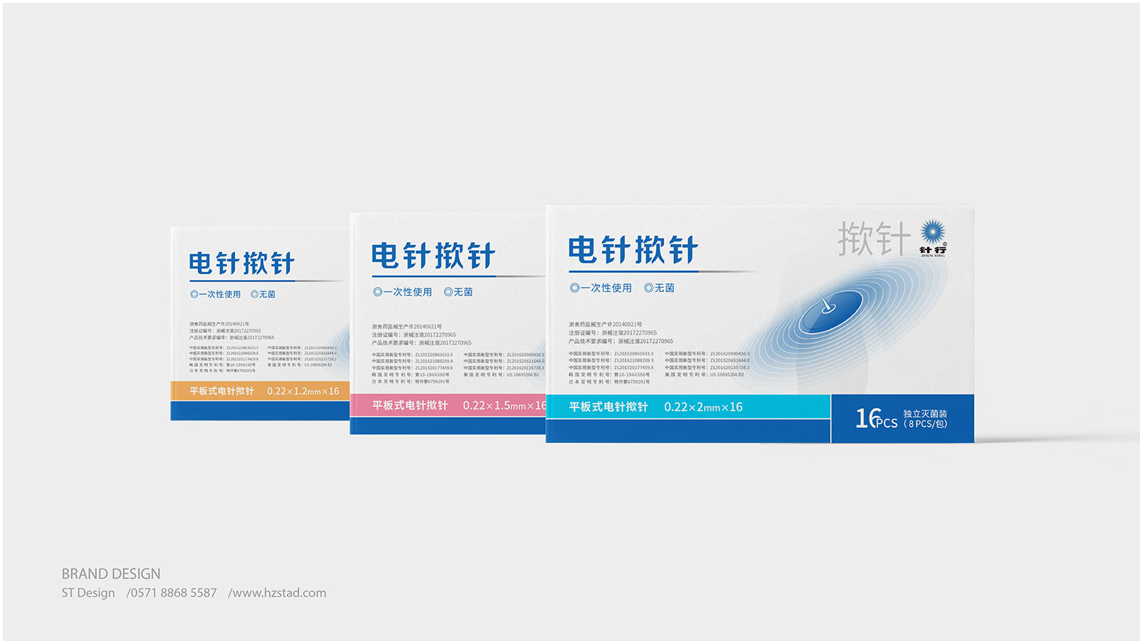 系列一:包裝設計來源于電針撳針治療的過程,以產品圖案的藍色放射狀給人帶來感官上的治療感受,擴散的波紋表示電針治療與常規(guī)撳針的區(qū)分和使用的顯著效果。整體色調偏于亮藍色遵循了企業(yè)主視覺品牌色和藥物特殊屬性使用的創(chuàng)新體驗。