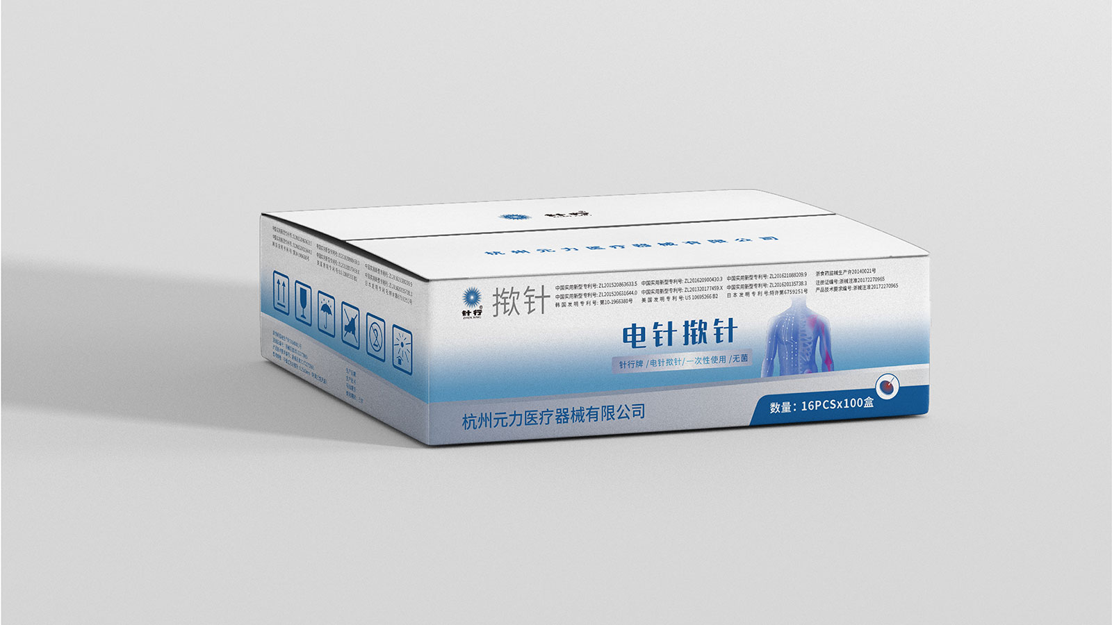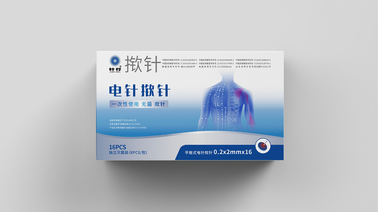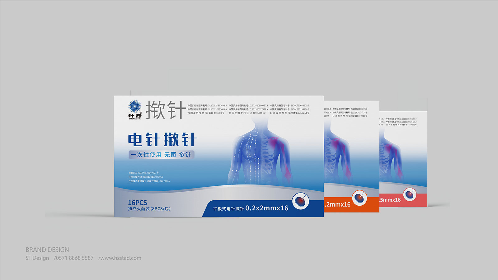 系列二:此款包裝主要圖案設計出發(fā)點于電針撳針的主要特點,電針撳針相對于常規(guī)撳針對于病患者需治療效果更直接,主圖案上以色塊形式表現人體局部及穴位通過電波圖與電針的藝術融合直接凸顯電針科技的特征。使傳統(tǒng)中醫(yī)與現代科學的完美結合。