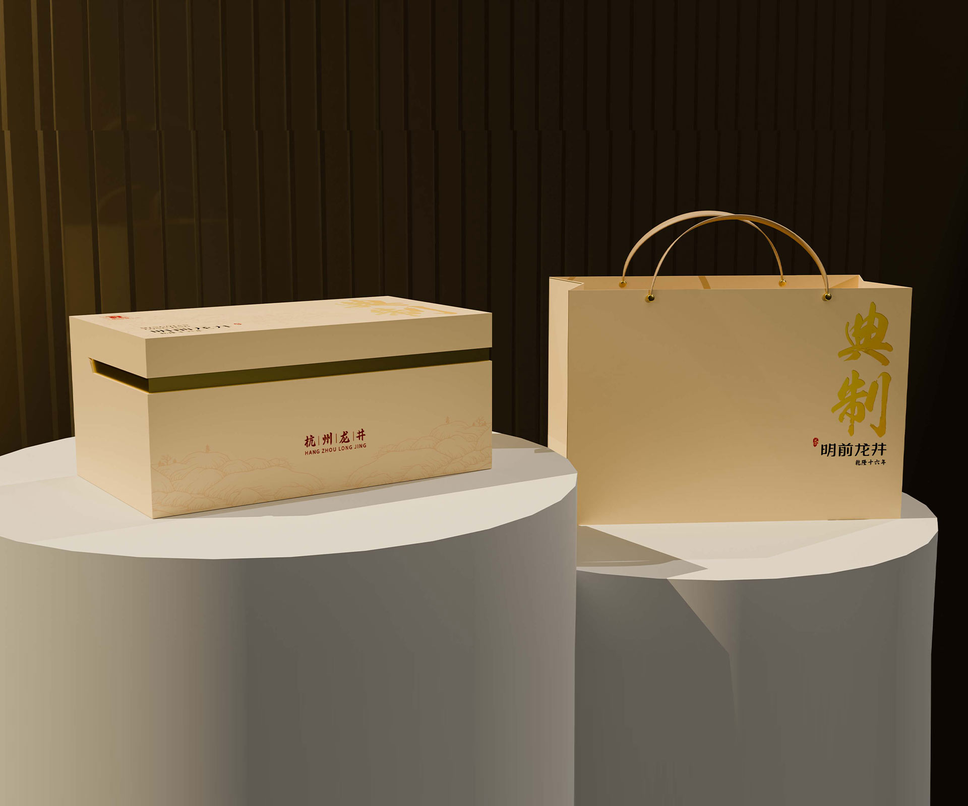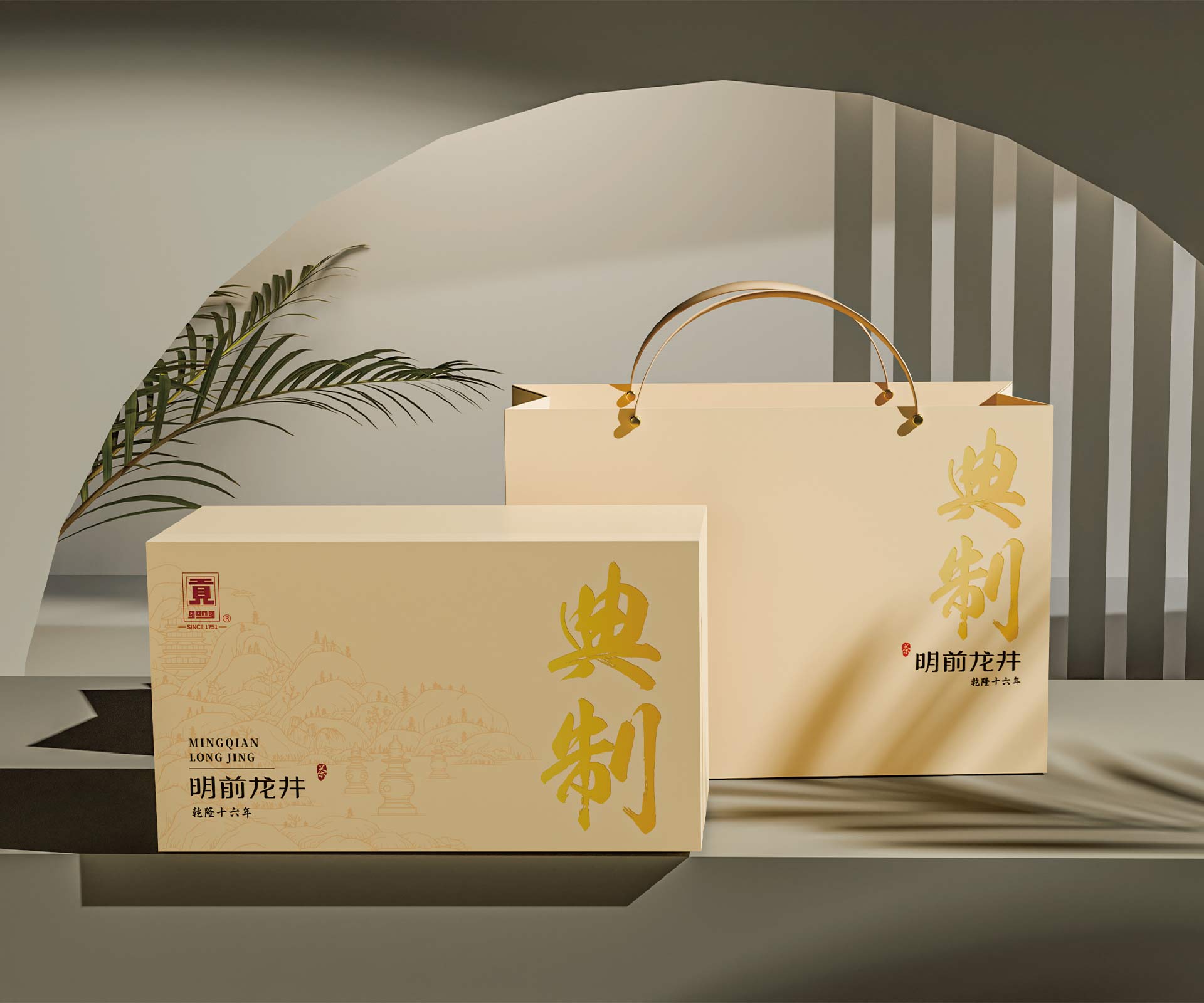 本款“典制系列西湖龍井茶明前龍井禮盒包裝”設計案例,旨在通過精致、傳統的包裝形式,展現西湖龍井茶的獨特韻味與高端品質。設計靈感來源于中國傳統茶文化,結合現代審美趨勢,力求打造一款既符合傳統審美又具現代感的禮盒包裝。