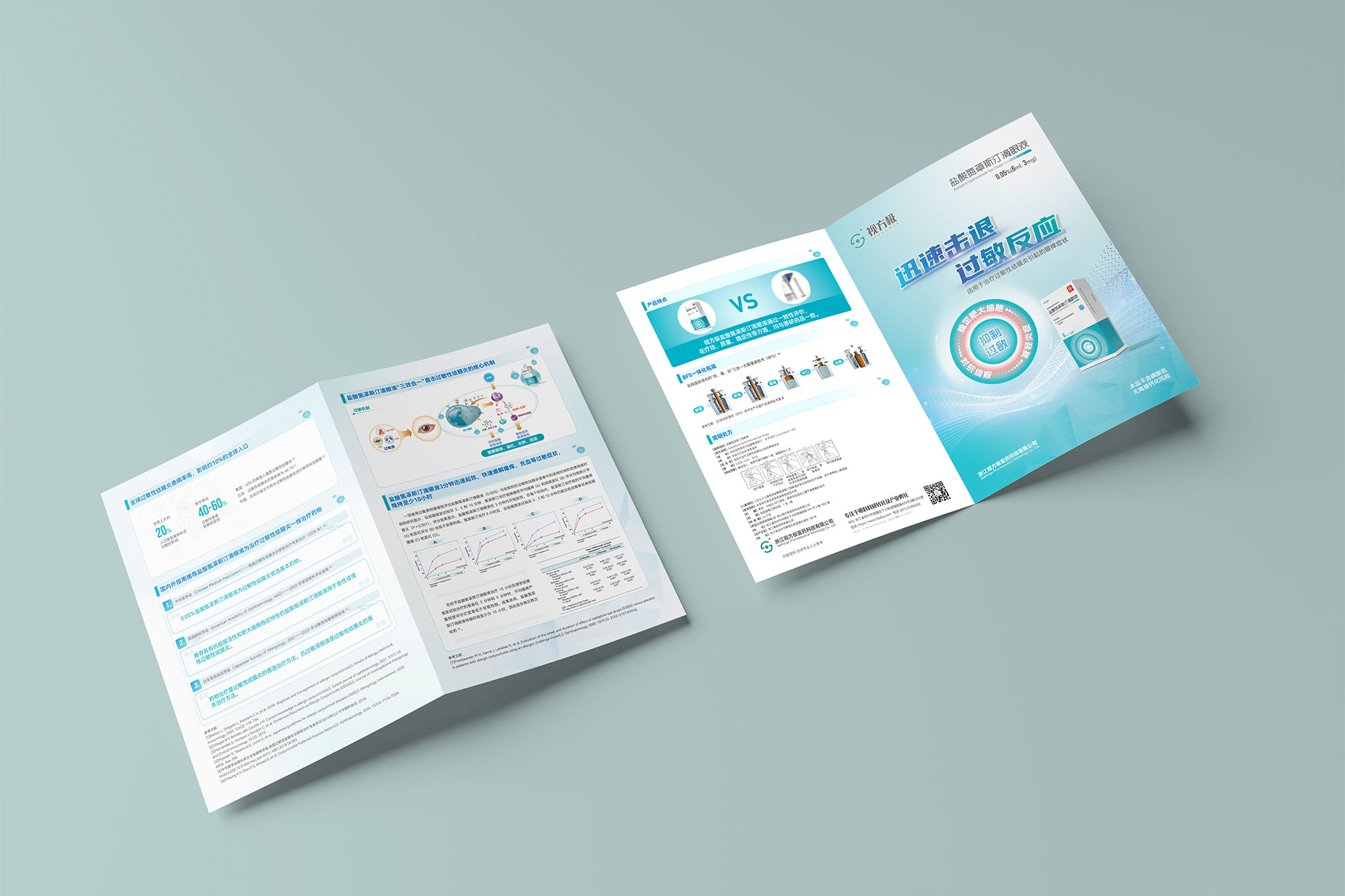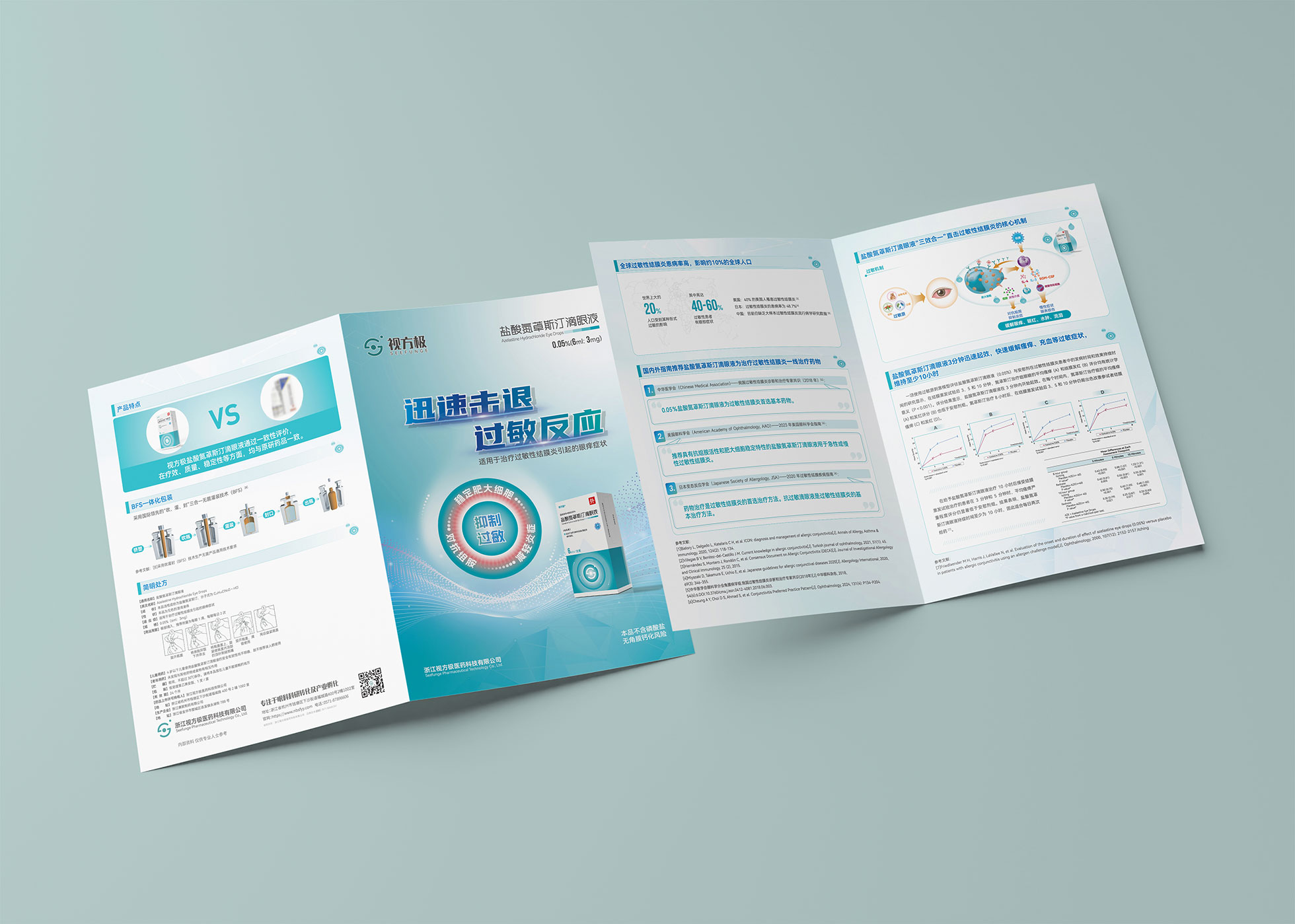 本項目是石特大健康為浙江視方極醫藥科技有限公司的核心產品——鹽酸氮?斯汀滴眼液,所提供的從終端包裝到專業DA(Detail Aid) 的一站式整合設計服務。該產品用于治療過敏性結膜炎,其市場成功既依賴于在藥店貨架上對消費者的直接吸引力,也離不開面向眼科醫生的專業學術推廣。我們的挑戰在于,如何構建一個統一的品牌視覺體系,使其在包裝上能清晰傳遞產品功效、激發購買欲望,同時在DA上能專業地呈現藥物機理和臨床優勢,成為醫生可信賴的處方依據,最終實現“藥店動銷”與“臨床推廣”的雙輪驅動。
