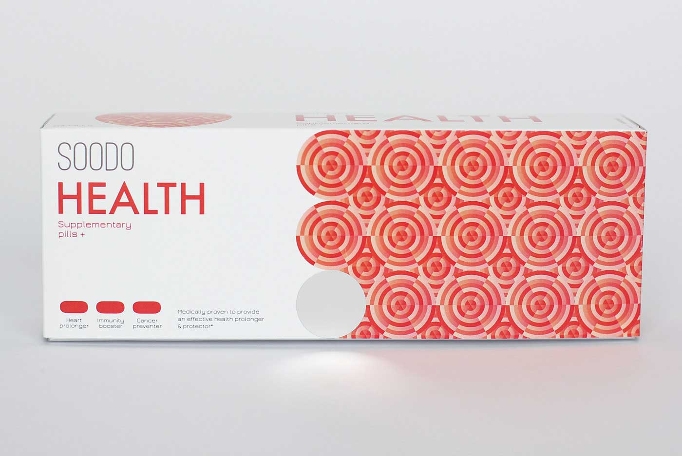 SOODO補藥是促進健康的營養包,作為膳食纖維的替代品。這個項目涉及對現有的方案進行重新調整,并在新的背景下進行介紹。基本結構取自巧克力包。我選擇采取諷刺和象征性的方法,創建新的包裝,讓它能在醫學環境中促進健康。我的目的是創造一個能在未來環境中存在的抽象產品包裝,以強調這代人對天然產物的選擇。
